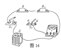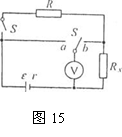 (8分)如图15中R为已知电阻,Rx为待测电阻,s1为单刀单掷并关,s2为单刀双掷开关,V为电压表(内阻极大),E为电源(内阻不可忽略)。现用图中电路测量电源电动势ε及电阻Rx。