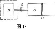 (10分)如图18所示.水平放置的气缸A通过细管与固定体积的容器B相连接,事先将容器B抽成真空后把阀门S关闭。气缸A内贮有一定质量的理想气体,活塞D可在气缸内作无摩擦滑动。气缸A置于温度是27℃、压强为1.O×105帕的大气中时,活塞左侧气缸容积VA=4.8升。容器B的容积VB=2.4升.置于温度为127℃的恒温箱内。气缸A和容器B的器壁都是热的良导体,打开阀门S后,一部分气体将由A进入B。试求当活塞D停止运动时。