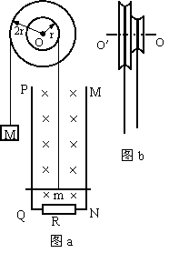 24.(14分)如图(a)所示,轮轴的轮半径为2r,轴半径为r,它可以绕垂直于纸面的光滑水平轴O转动,图(b)为轮轴的侧视图。轮上绕有细线,线下端系一质量为M的重物,轴上也绕有细线,线下端系一质量为m的金属杆。在竖直平面内有间距为L的足够长平行金属导轨PQ、MN,在QN之间连接有阻值为R的电阻,其余电阻不计。磁感强度为B的匀强磁场与导轨平面垂直。开始时金属杆置于导轨下端,将重物由静止释放,重物最终能匀速下降,运动过程中金属杆始终与导轨接触良好。