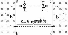 21.如图所示,ab和cd为两条相距较远的平行直线,ab的左边和cd的右边都有磁感应强度为B且方向垂直纸面向里的匀强磁场,虚线是由两个相同的半圆及和半圆相切的两条线段组成。甲、乙两带电体分别从图中虚线上的A、D两点以不同的初速度开始分别向两边运动,轨迹正好和虚线重合,它们在C点(图中未画出,位置在另一虚线线段上)碰撞后结为一体向右运动,两带电体的重力忽略不计,则下面说法正确的