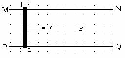 ,开始时两杆均静止且无间距,现对杆ab施加一水平向右恒力F(F>2μmg)的作用,使杆ab沿导轨向右运动,恒力作用t秒末杆ab的速度达到v,且电路的热功率开始进入稳定状态。若忽略两杆电流之间的相互作用,且两杆始终垂直于导轨。求: