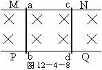 如图12-4-8所示,MN和PQ为平行放置的光滑金属导轨,其电阻不计,ab、cd为两根质量均为m的导体棒,垂直置于导轨上,导体棒有一定电阻,整个装置处于竖直向下的匀强磁场中,原来两导体棒都静止,当ab棒受到瞬时冲量而向右以速度