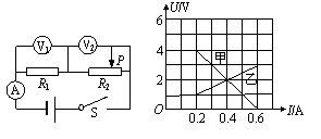 下左图电路中,R1为定值电阻,R2为滑动变阻器。闭合电键S,将滑动触头P从最右端滑到最左端过程中,两只电压表的示数随电路中电流变化的完整过程图线如下右图所示。下列判断正确的是