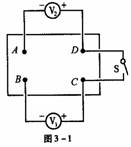 (3)(6分)如图3-1所示的暗箱有A、B、C、D共4个接线柱,V1、V2是两个分别连接在B、C和D、A接线柱上的理想电压表,S为连接在C、D接线柱上的开关。现有两节完全相同的普通干电池(电动势和内阻均相同)以及R1=3Ω,R2=2Ω的电阻各一只,还有供连接用的导线若干。某实验小组选用这些组件相互串联装入暗箱中,实验发现:w.w.^w.k.s.5*