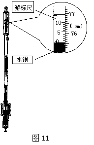 15.图11所示为实验室常用的气压计结构示意图,它是根据托里拆利实验原理制成的。管中水银柱的高度(即为当时的大气压数值)通过带有游标的刻度尺读出。图中的读数部分被放大,从放大的图中读出测量的大气压强值为_____ mmHg。