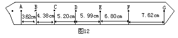 16.某同学在“测匀变速直线运动的加速度”的实验中,用打点计时器记录了被小车拖动的纸带的运动情况,在纸带上确定出A、B、C、D、E、F、G共7个计数点。其相邻点间的距离如图12所示,每两个相邻的计数点之间的时间间隔为0.10s。