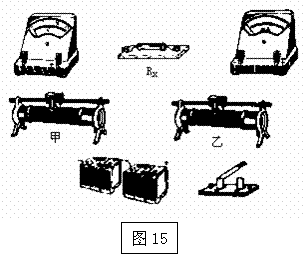 17.图14所示是“用伏安法测量电阻”的实验电路图,只是电压表未接入电路中。图15是相应的实验器材,其中待测量的未知电阻Rx阻值约为1kΩ,电流表量程20mA、内阻小于1Ω,电压表量程15V、内阻约1.5kΩ,电源输出电压约12V。滑动变阻器甲的最大阻值为200Ω,乙的最大阻值为20Ω。