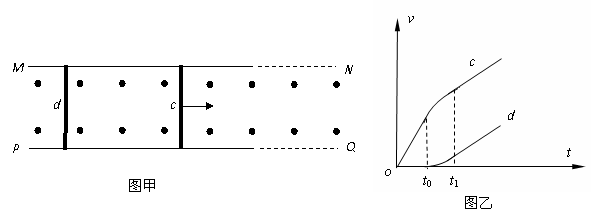 16.(14分)如图甲所示,相距为L的两平行金属导轨MN、PQ固定在绝缘水平面上,处于竖直向上的匀强磁场中,磁场的磁感应强度为B,导轨足够长且电阻不计.两相同金属棒c和d与导轨垂直放置,它们的质量均为m,电阻均为R,间距为s0,与导轨间动摩擦因数均为μ,设最大静摩擦力与滑动摩擦力相等.在t=0时刻,对c棒施加一水平向右的力,使其从静止开始做匀加速直线运动.在t0时刻,d棒开始运动,此后保持水平力不变,由速度传感器测得两金属棒的v-t图象如图乙所示,从t1时刻开始两金属棒以相同的加速度做匀加速直线运动,此时两金属棒的间距为s.试求: