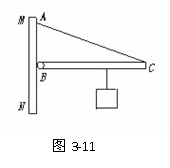 (★★★★)如图3-11所示,长为l的均匀横杆BC重为100 N,B端用铰链与竖直的板MN连接,在离B点