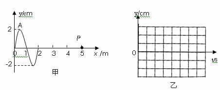 (3)如果以该机械波传到质点p开始计时,请在下图乙中画出p点的振动图像,并标明必要的数字,至少画出一个周期的图像。