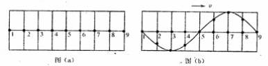 1、在均匀介质中选取平衡位置在同一直线上的9个质点.相邻两质点的距离均为L,如图 (a)所示。一列横波沿该直线向右传播,t=0时到达质点1,质点1开始向下运动,经过时 间△t第一次出现如图(b)所示的波形。则该波的