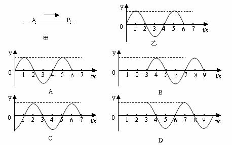 8、一列简谐横波以1m/s的速度沿绳子由A向B传播,质点A、B间的水平距离x=3m,如图甲所示.若t=0时 质点A刚从平衡位置开始向上振动,其振动图象如图乙所示,则B点的振动图象为下图中的B