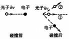 3、如图所示为康普顿效应示意图,光子与一个静止的电子发生碰撞,图中标出了碰撞后电子的运动方向。设碰前光子频率为v,碰后为v′,则关于光子碰后的运动方向和频率的说法中正确的是 ( )