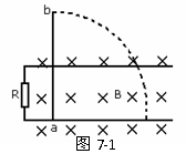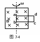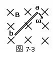 :如图7-3所示,长为L的金属棒ab,绕b端在垂直于匀强磁场的平面内以角速度ω匀速转动,磁感应强度为B,求ab两端的电势差。