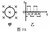 例7:一个圆形闭合线圈固定在垂直纸面的匀强磁场中,线圈平面与磁场方向垂直,如图7-5甲所示。设垂直纸面向里的磁感应强度方向为正,垂直纸面向外的磁感应强度方向为负。线圈中顺时针方向的感应电流为正,逆时针方向的感应电流为负。已知圆形线圈中感应电流i随时间变化的图象如图7-5乙所示,则线圈所在处的磁场的磁感应强度随时间变化的图象可能是( )