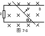 例8:如图7-6所示,金属导轨间距为d,左端接一电阻R,匀强磁场的磁感应强度为B,方向垂直于平行金属导轨所在的平面,一根长金属棒与导轨成θ角放置,金属棒与导轨电阻不计。当金属棒沿垂直于棒的方向,以恒定速度v在金属导轨上滑行时,通过电阻的电流强度为