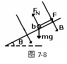 [审题]求在加速下滑过程中ab杆的加速度首先要明确ab杆的受力情况,从b向a看ab杆的受力示意图如图7-8所示,根据受力情况结合牛顿第二定律即可求解。另外根据受力情况还可以判断ab杆的运动情况,ab杆下滑过程中速度越来越大,安培力F越来越大,其合外力越来越小,加速度越来越小,当加速度为零时速度最大,所以ab杆做的是加速度逐渐减小的加速运动,最后以最大速度匀速运动。根据ab杆达最大速度时合外力为零可求其最大速度。