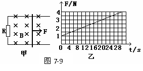 例10:如图7-9甲所示,一对平行光滑轨道放置在水平面上,两轨道间距L=0.20m,电阻R=1.0Ω,有一导体杆静止放在轨道上,与两轨道垂直,杆及轨道的电阻可忽略不计,整个装置处于磁感强度B=0.50T的匀强磁场中,磁场方向垂直轨道面向下,现用一外力F沿轨道方向拉杆,使之做匀加速运动,测得力F与时间t的关系如图7-9乙所示,求杆的质量m和加速度a.