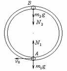 [例3]一内壁光滑的环形细圆管,位于竖直平面内,环的半径为R(比细管的半径大得多).在圆管中有两个直径与细管内径相同的小球(可视为质点).A球的质量为m1,B球的质量为m2.它们沿环形圆管顺时针运动,经过最低点时的速度都为v0.设A球运动到最低点时,B球恰好运动到最高点,若要此时两球作用于圆管的合力为零,那么m1、m2、R与v0应满足的关系式是______.