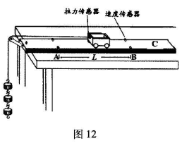 15.(10分)某实验小组利用拉力传感器和速度传感器探究“动能原理”。如图12,他们将拉力传感器固定在小车上,用不可伸长的细线将其通过一个定滑轮与钩码相连,用拉力传感器记录小车受到拉力的大小。在水平面上相距50.0cm的A、B两点各安装一个速度传感器,记录小车通过A、B时的速度大小、小车中可以放置砝码。