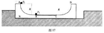 2.(08年广东省)(17分)如图17所示,固定的凹槽水平表面光滑,其内放置U形滑板N,滑板两端为半径R=0.45m的1/4圆弧面。A和D分别是圆弧的端点,BC段表面粗糙,其余段表面光滑。小滑块P1和P2的质量均为m。滑板的质量M=4m,P1和P2与BC面的动摩擦因数分别为μ1=0.10和μ2=0.40,最大静摩擦力近似等于滑动摩擦力。开始时滑板紧靠槽的左端,P2静止在粗糙面的B点,P1以v0=4.0m/s的初速度从A点沿弧面自由滑下,与P2发生弹性碰撞后,P1处在粗糙面B点上。当P2滑到C点时,滑板恰好与槽的右端碰撞并与槽牢固粘连,P2继续运动,到达D点时速度为零。P1与P2视为质点,取g=10m/s2. 问: