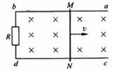 3.如图所示,两根相距为l的平行直导轨ab、cd、b、d间连有一固定电阻R,导轨电阻可忽略不计。MN为放在ab和cd上的一导体杆,与ab垂直,其电阻也为R。整个装置处于匀强磁场中,磁感应强度的大小为B,磁场方向垂直于导轨所在平面(指向图中纸面内)。现对MN施力使它沿导轨方向以速度v(如图)做匀速运动。令U表示MN两端电压的大小,则 ( )