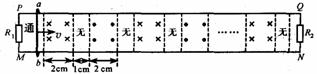 5. 平行轨道PQ、MN两端各接一个阻值R1=R2=8Ω的电阻,轨道间距L=1 m,轨道很长,本身电阻不计.轨道间磁场按如图所示的规律分布,其中每段垂直纸面向里和向外的磁场区域宽度均为2 cm,磁感应强度的大小均为B=1 T,每段无磁场的区域宽度均为1 cm,导体棒ab本身电阻r=1Ω,与轨道接触良好.现使ab以v=10 m/s向右匀速运动.求: