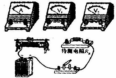 ,显然不能用电流表来测电流,而应该把其中一个电压表V1当电流表来使用。根据比值法容易判断出待测电阻是大电阻,伏安法应使用内接法。