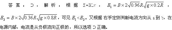 21.如图所示,两个端面半径同为R的圆柱形铁芯同轴水平放置,相对的端面之间有一缝隙,铁芯上绕导线并与电源连接,在缝隙中形成一匀强磁场.一铜质细直棒ab水平置于缝隙中,且与圆柱轴线等高、垂直.让铜棒从静止开始自由下落,铜棒下落距离为0.2R时铜棒中电动势大小为