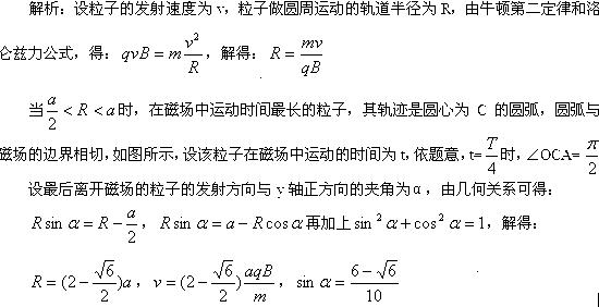 到a之间,从发射粒子到粒子全部离开磁场经历的时间恰好为粒子在磁场中做圆周运动周期的四分之一.求最后离开磁场的粒子从粒子源射出时的(1)速度大小;(2)速度方向与y轴正方向夹角正弦。