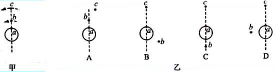 m的卫星,c是地球同步卫星,某一时刻b、c刚好位于a的正上方(如图甲所示),经48h,a、b、c的大致位置是图乙中的(取地球半径R=6.4![]()