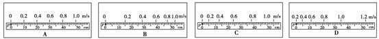 物理实验小组利用如图4-1-15所示装置测量物体平抛运动的初速度.他们经多次实验和计算后发现:在地面上沿抛出的速度方向水平放置一把刻度尺,让悬挂在抛出点处的重锤线的投影落在刻度尺的零刻度线上,则利用小球在刻度尺上的落点位置,就可直观地得到小球做平抛运动的初速度.如图四位同学在刻度尺旁边分别制作了速度标尺(图中P点为重锤所指位置),可能正确的是( )