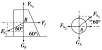 解析:小球A和木块B受力分析如图所示,对A:FN1cos 60°=GA,FN1sin 60°=FN2,可得:FN1=300 N,FN2=150 N,可知选项A正确、B错误;对B:由FN1′=FN1,FN1′cos 60°+GB=FN3及FN1′sin 60°=Ff可得:FN3=1 650 N,Ff=150 N,所以选项C错误、D正确.