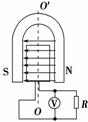 如图10-1-20所示,面积为S、匝数为N、电阻为r的线圈固定在图示位置,线圈与阻值为R的电阻构成闭合电路,理想交流电压表并联在电阻R的两端;U形磁铁以线圈的中心轴线OO′为轴以角速度ω匀速转动,已知U形磁铁两极间的磁场为匀强磁场,磁感应强度为B,取磁铁转动到图示位置的时刻t=0.则( )