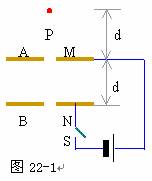 25、如图22-1所示,A、B为平行金属板,两板相距为d,分别与电源两极相连,两板的中央各有小孔M、N。今有一带电质点,自A板上方相距为d的P点由静止自由下落(P、M、N三点在同一竖直线上),空气阻力不计,到达N点时速度恰好为零,然后按原路径返回。若保持两板间的电压不变,则: