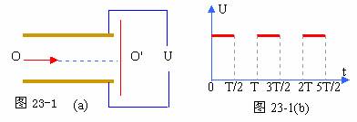 26、两平行金属板相距为d,加上如图23-1(b)所示的方波形电压,电压的最大值为U0,周期为T。现有一离子束,其中每个离子的质量为m,电量为q,从与两板等距处沿着与板平行的方向连续地射入两板间的电场中。设离子通过平行板所需的时间恰为 T(与电压变化周期相同),且所有离子都能通过两板间的空间打在右端的荧光屏上。试求:离子击中荧光屏上的位置的范围。(也就是与O‘点的最大距离与最小距离)。重力忽略不计。