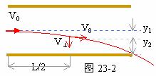 时间内,两板间没有电压,离子以V速度作匀速直线运动,侧向位移为y2,如图23-2所示。这些离子在离开电场时,侧向位移有最大值,即(y1+y2)。