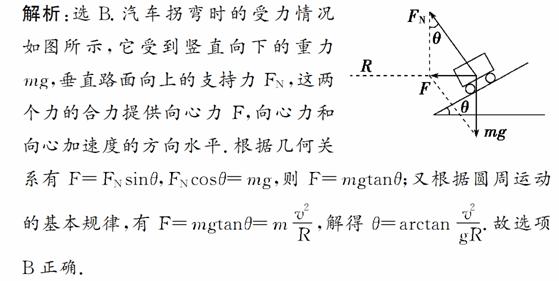 7.在高速公路的拐弯处,路面要修建的外高内低,即当车向右拐弯时,司机左侧的路面比右侧的应高一些.路面与水平面的夹角为θ,设拐弯路段是外半径为R的圆弧,要使车速为v时车轮与路面之间的横向(即垂直于前进方向)摩擦力等于零,θ应等于( )