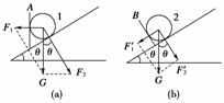 [解析] 本题是典型的根据重力的作用效果进行力的分解的应用,挡板在斜面上的方向不同,重力的作用效果就不同.球1重力分解如图(a)所示,F1=Gtanθ,F2=;球2重力分解如图(b)所示,F1′=Gsinθ,F2′=Gcosθ.