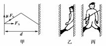 (1)运动员在两墙之间“挂”着时,墙的反作用力的方向一定是沿着运动员的腿,受力的几何图如下图甲所示.给出下列关系式,μ为动摩擦因数,有: