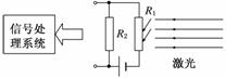 进行信号处理,当激光照到光敏电阻时,R1的阻值变小,总电流变大,则R2两端获