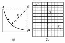 5.某同学采用半径R=25 cm的1/4圆弧轨道做平抛运动实验,其部分实验装置示意图如图甲所示.实验中,通过调整使出口末端B的切线水平后,让小球从圆弧顶端的A点由静止释放.图乙是小球做平抛运动的闪光照片,照片中的每个正方形小格的边长代表的实际长度为4.85 cm.已知闪光频率是10 Hz.则根据上述的信息可知( )