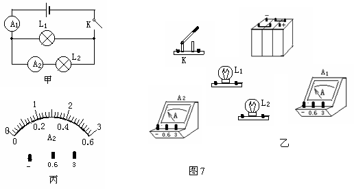 16.根据图7甲所示电路图,若开关K闭合后通过电流表A1的电流为0.9A,通过灯L1的电流为0.2A。