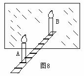 李丽同学在探究平面镜成像特点实验时,将一块玻璃板竖直架在一直尺的上面,再取两段等长的蜡烛A和B一前一后竖放在直尺上,点燃玻璃板前的蜡烛A,用眼睛进行观察,如图8所示。在此实验中: