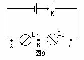 陈红同学为了研究串联电路中电流的规律,做了如图9所示的实验。在实验中当K闭合时,两个小灯泡都能发光,但L1比L2亮。