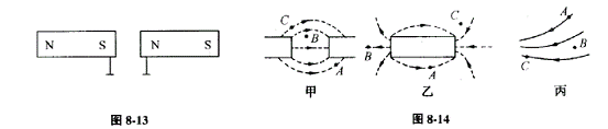 34,(6分)已知磁铁周围磁感线的分布和方向如图8-14所示.试标出磁铁的磁极,并标出图中A、B、C三处所放小磁针在静止时N极所指的方向.