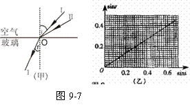 24.(8分)如图9-7(甲)所示,光I从空气斜射如玻璃中,发生了折射现象,从图中可以看出折射角r小于入射角i.那么,一般情况下,i与r有什么定量关系呢?1621年,荷兰学者斯涅尔通过实验终于找到了i与r之间的规律,图9-7(乙)是光从空气进入玻璃中时,利用实验数据得到的sinr与sini的关系图象.
