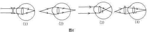 8.(05厦门)全国学生体质健康调研最新数据表明,我国小学生近视眼发生率为22.78%,中学生为55.22%,近视人群的急剧低龄化和扩大的趋势,令教育和医务工作者倍感担忧.图6表示来自物体的光经过远视眼或近视眼折射光系统折射后的成像情况和对它惊醒矫正的做法,其中表示近视眼成像情况的是第 图;表示对近视眼进行矫正的是第 图.