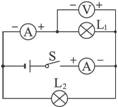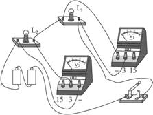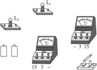 解析:把实物当作符号,依据题目要求,用曲线代替导线,把电池、开关、灯泡依次连接起来,最后,根据电压表的测量要求,分别跟两灯并联。连线时,接线点必须在接线柱上,导线不能交叉。