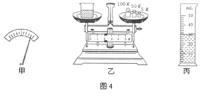 ⑵如图4(乙)显示的是烧杯中装入适量盐水后,置于调平的天平上,天平重新平衡时的情景;丙显示的是将烧杯中部分盐水倒人量筒后的情景。根据图中情景帮小东将下表填写完整。